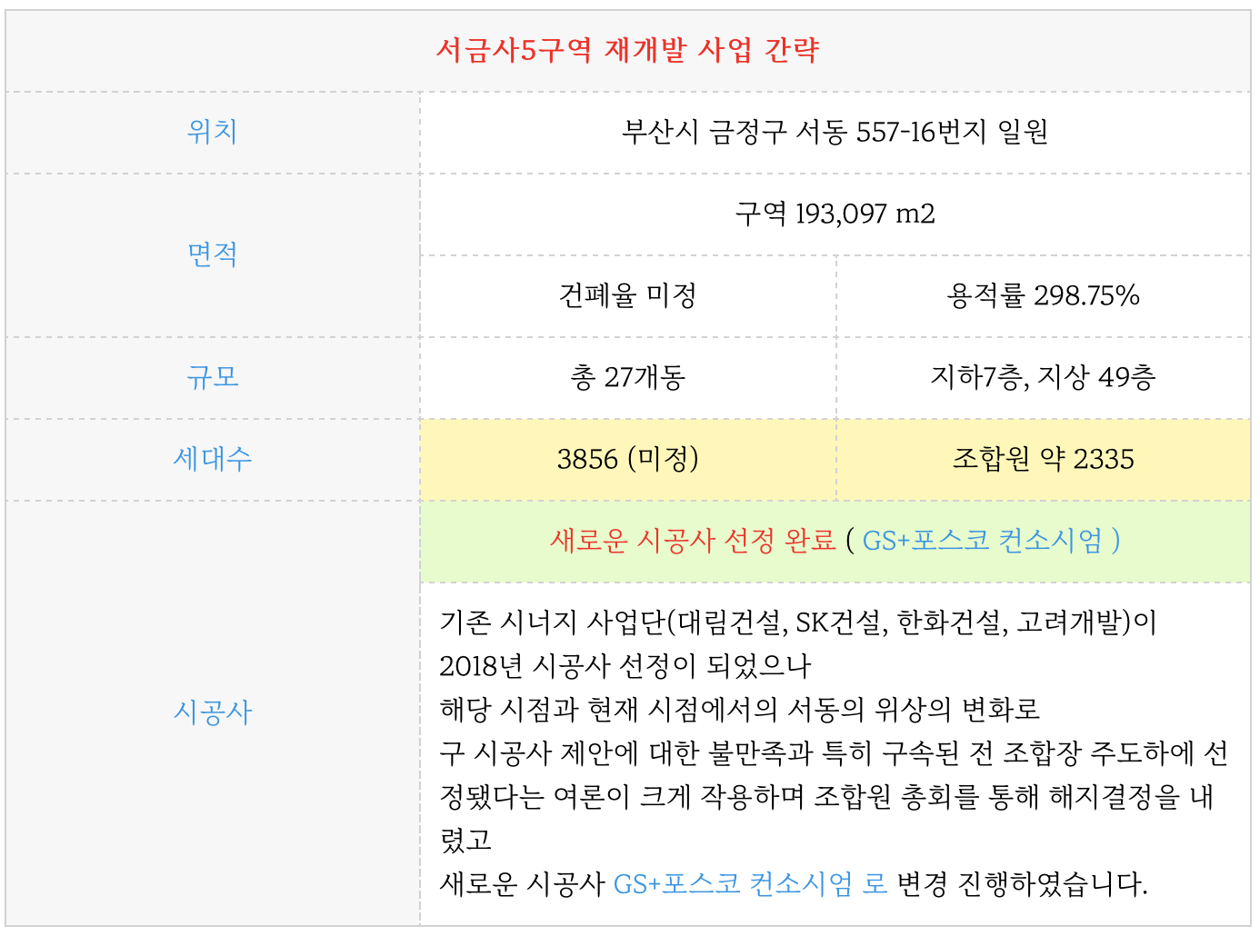 서금사5구역 재개발의 간략한 특징을 정리하였습니다.
