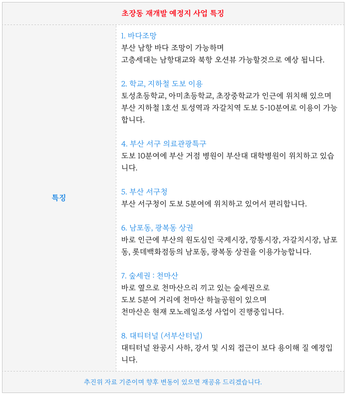 - 바다조망, 다수 학교, 지하철 도보이용, 의료관광특구, 원도심 접근성(남포동,광복동)