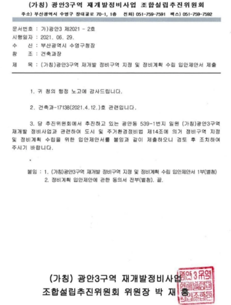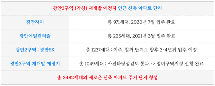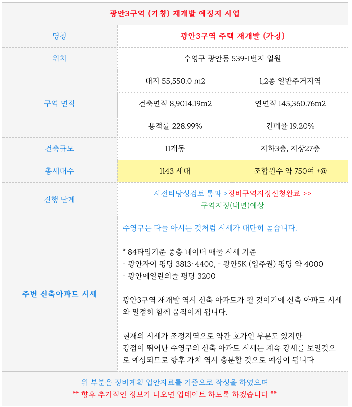 (가칭) 광안3구역 재개발 예정지의 현재까지의 진행상황등 및 타입별 세대수 등은 아래 페이지를 참고 부탁드립니다.