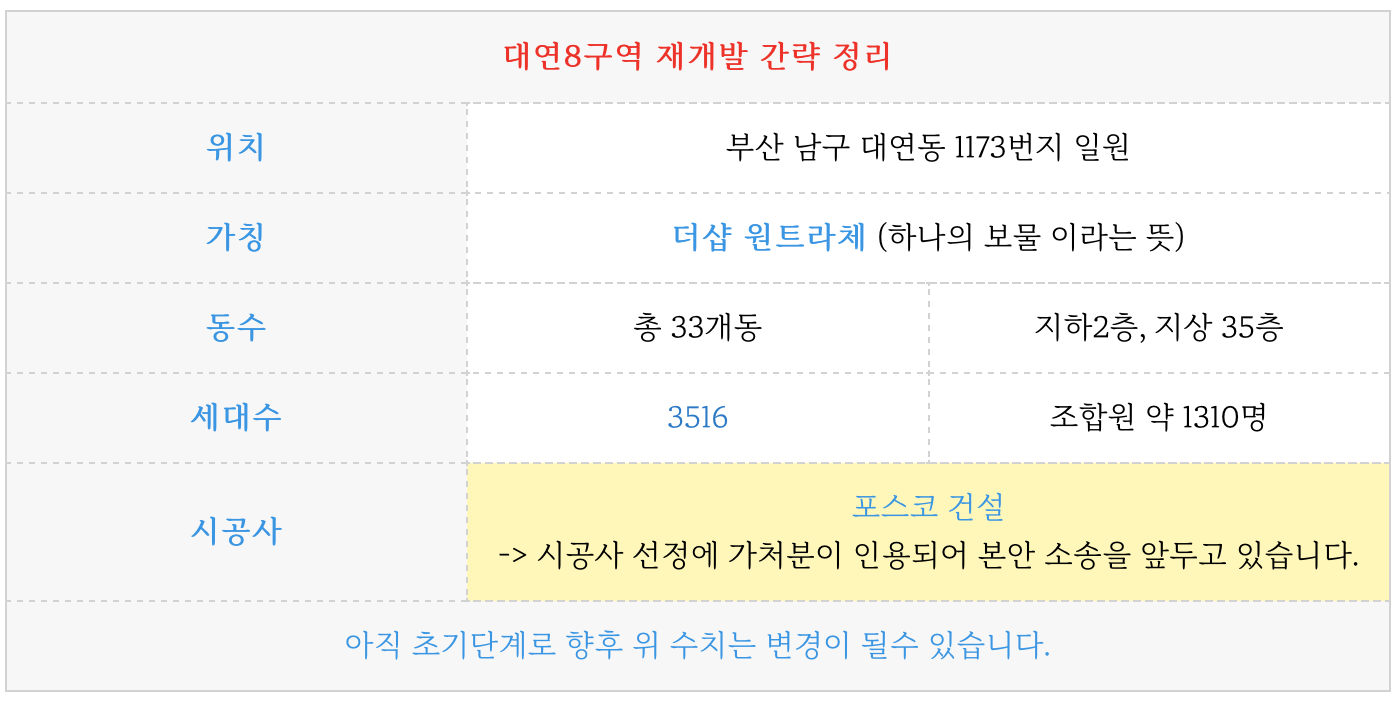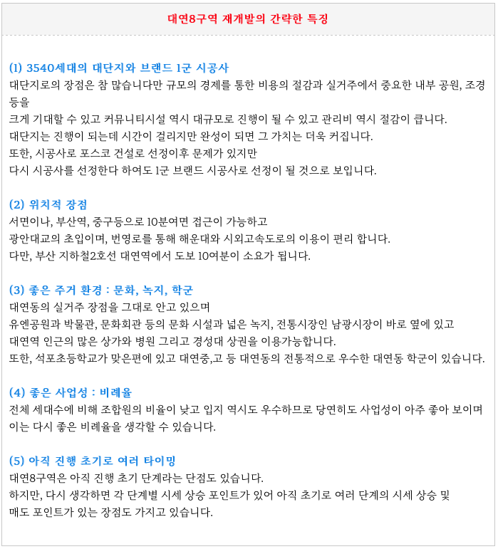 대연8구역 재개발의 간략한 특징들입니다.