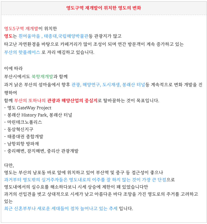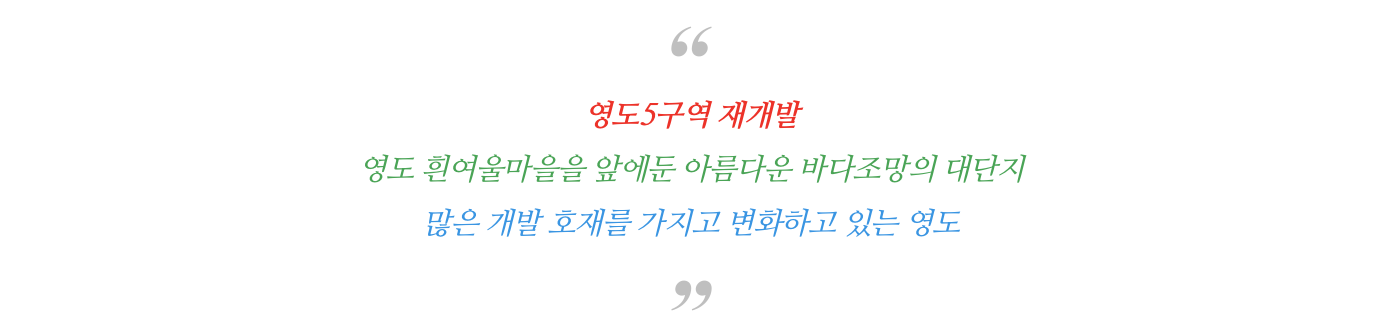 영도5구역 재개발 시공사 특화 동영상 및 조감도 소개와 가격 조정된 물건정보를 소개하여 드립니다.