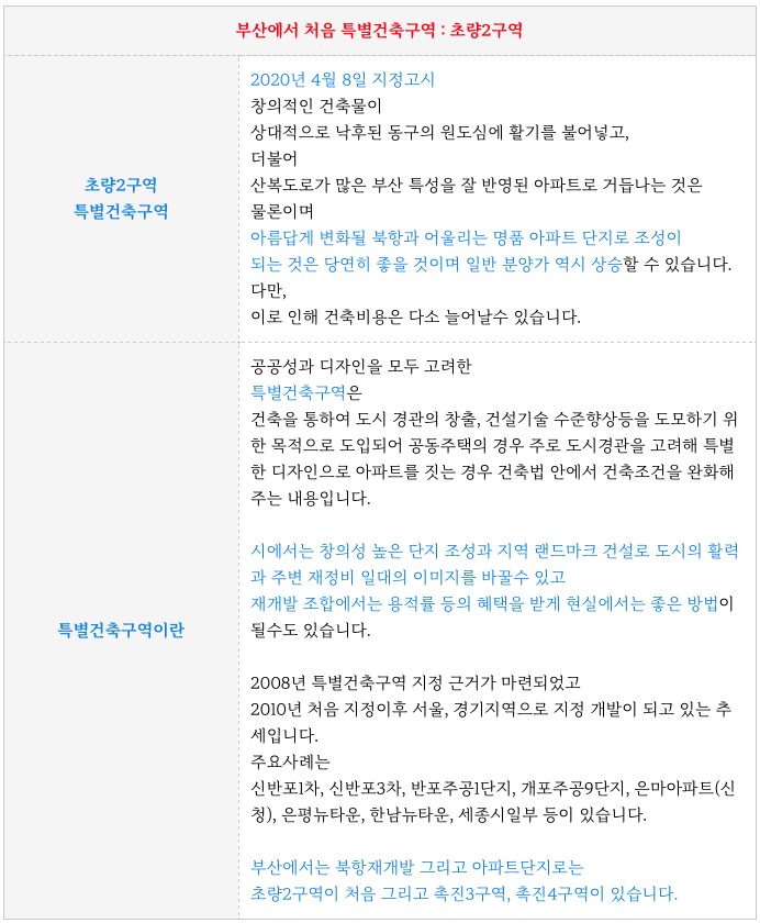 부산의 첫번째 특별건축구역으로 지정이 되어 향후 아파트의 외관등이 더욱 기대가 되는 곳입니다.