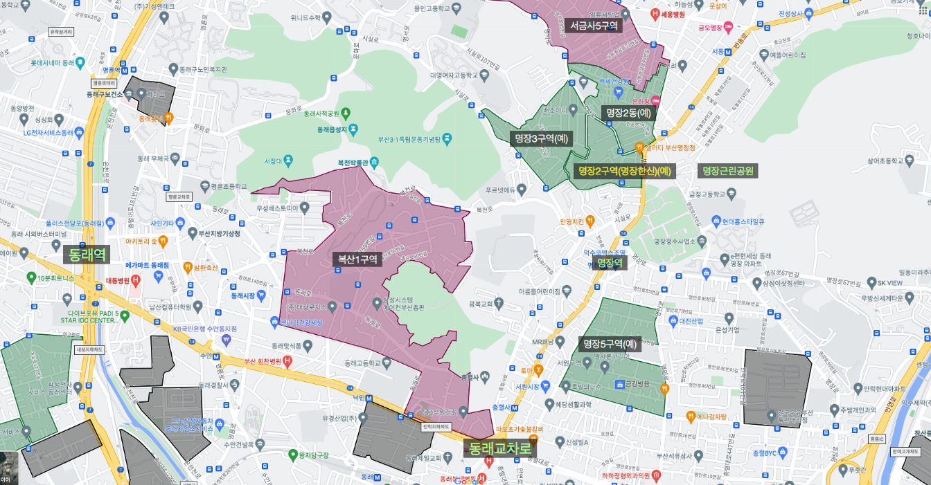 그리고 윗쪽으로 명장2동 재개발 예정지가 있고 그 위로는 서금사5구역이 있으며