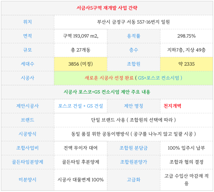 그 이유는 부산 전역의 전반 시세가 많이 상승하게 되면서 3억 언더의 인수가로 접근할수 있는 구역이 많지 않으며 그 중에서 서금사5구역의 입지나 향후 가치등으로 인해 선택을 많이 받게 되었었습니다.