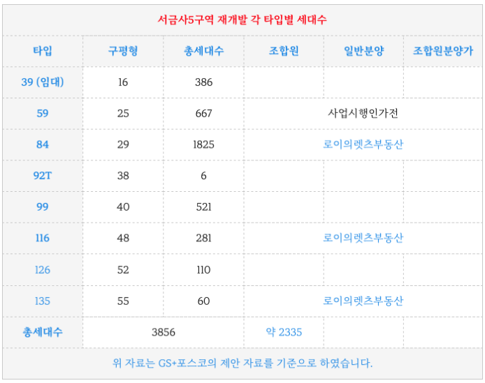 서금사5구역 재개발의 각 타입 세대수 입니다.