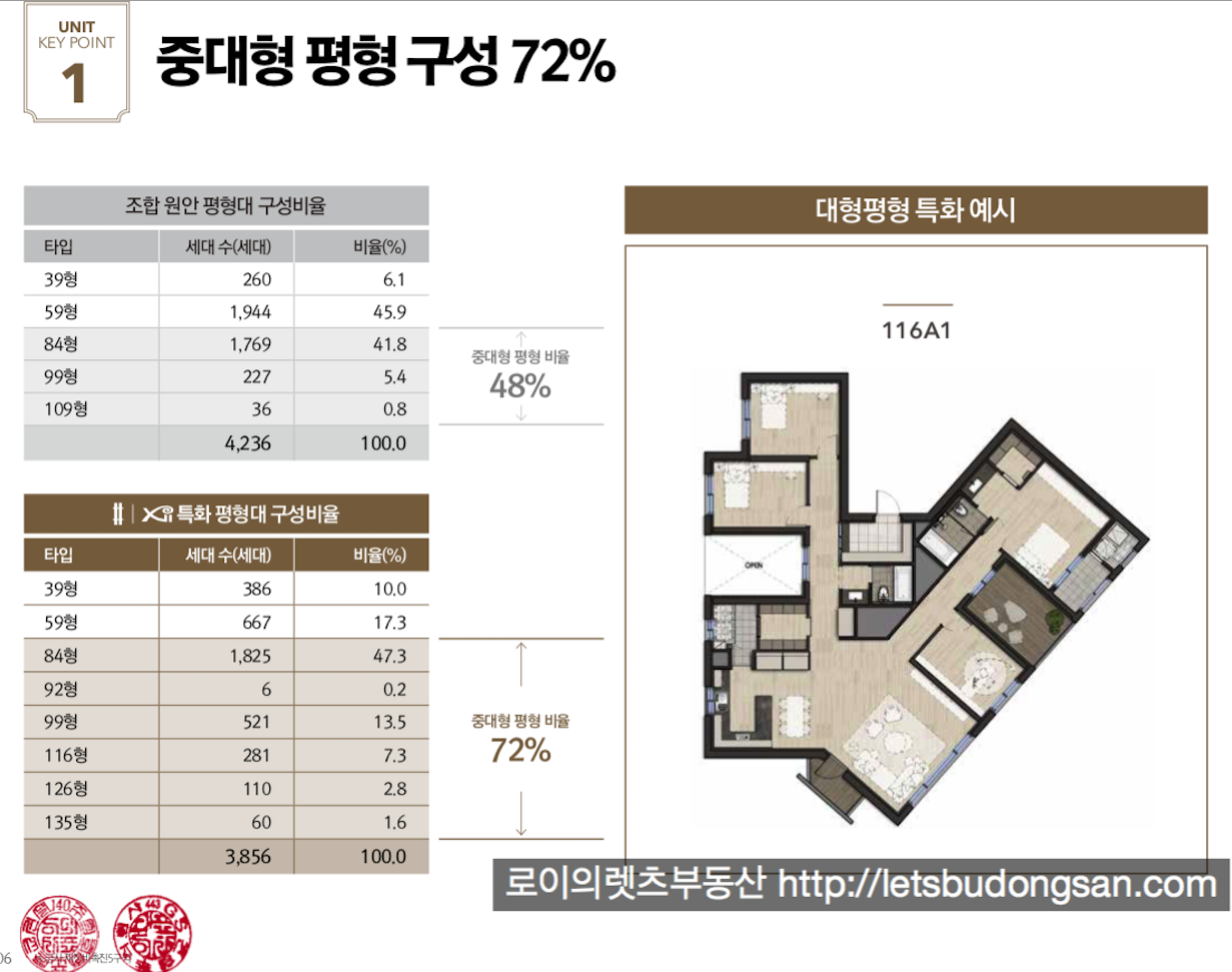 변경된 타입별 세대수는 기존 세대수에서 84타입 이상을 늘려 전체에서 72%를 차지 하고 있습니다.