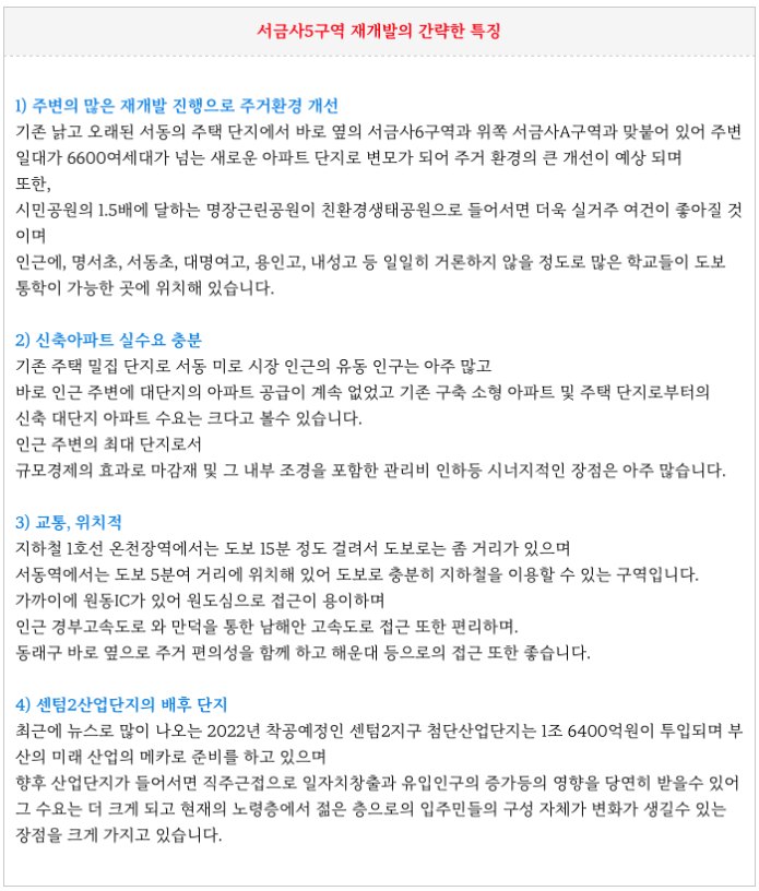 서금사5구역 재개발의 간략한 특징을 정리하였습니다.