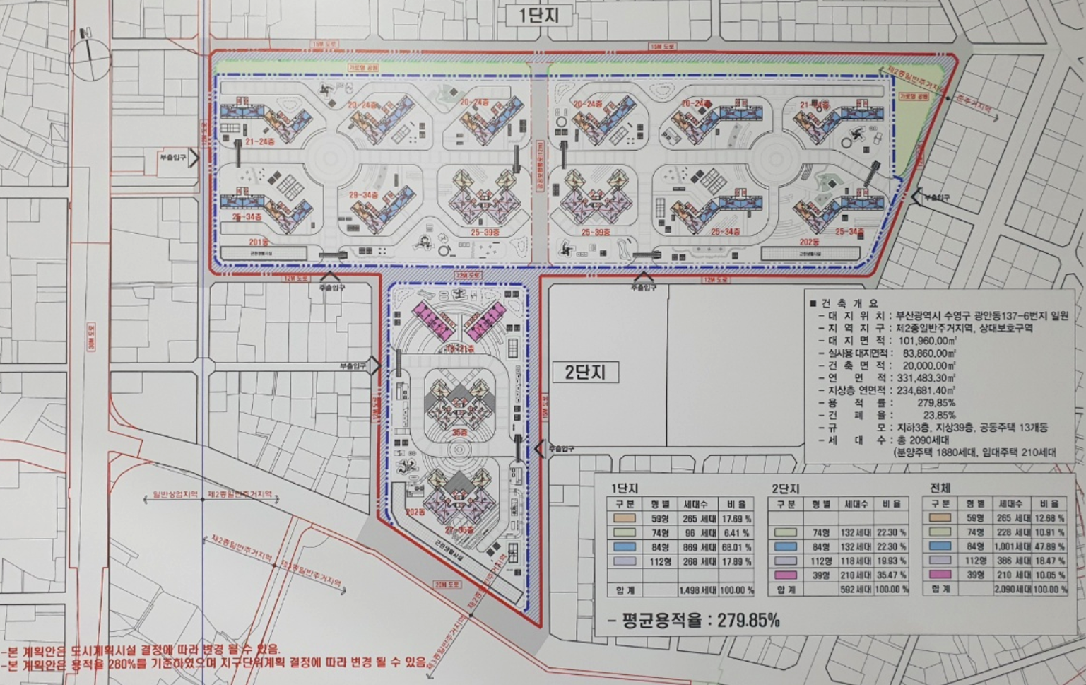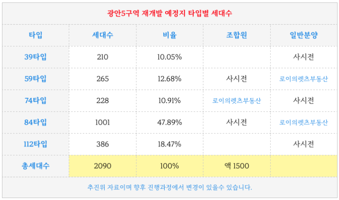 광안5구역 재개발 예정지의 예상 타입별 세대수 입니다.