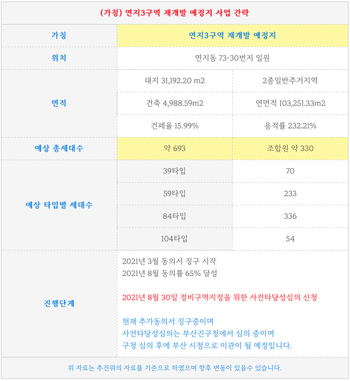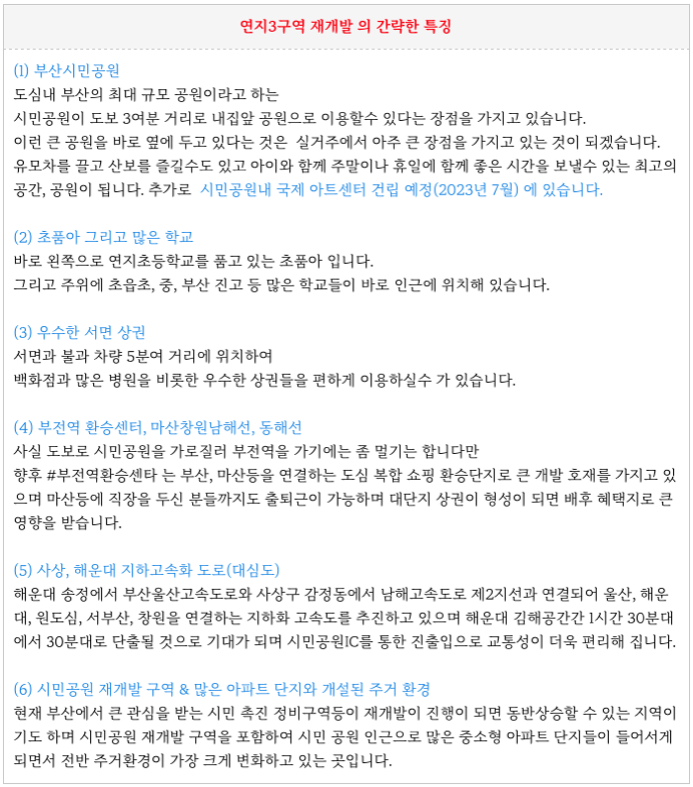 연지3구역 재개발의 간략한 특징을 다시 한번 정리하였습니다.