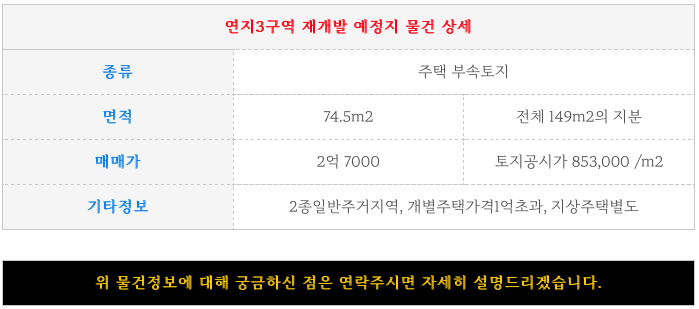 연지3구역 재개발 예정지에 대해 궁금하신 점은 연락주시면 자세히 설명 드리겠습니다.
