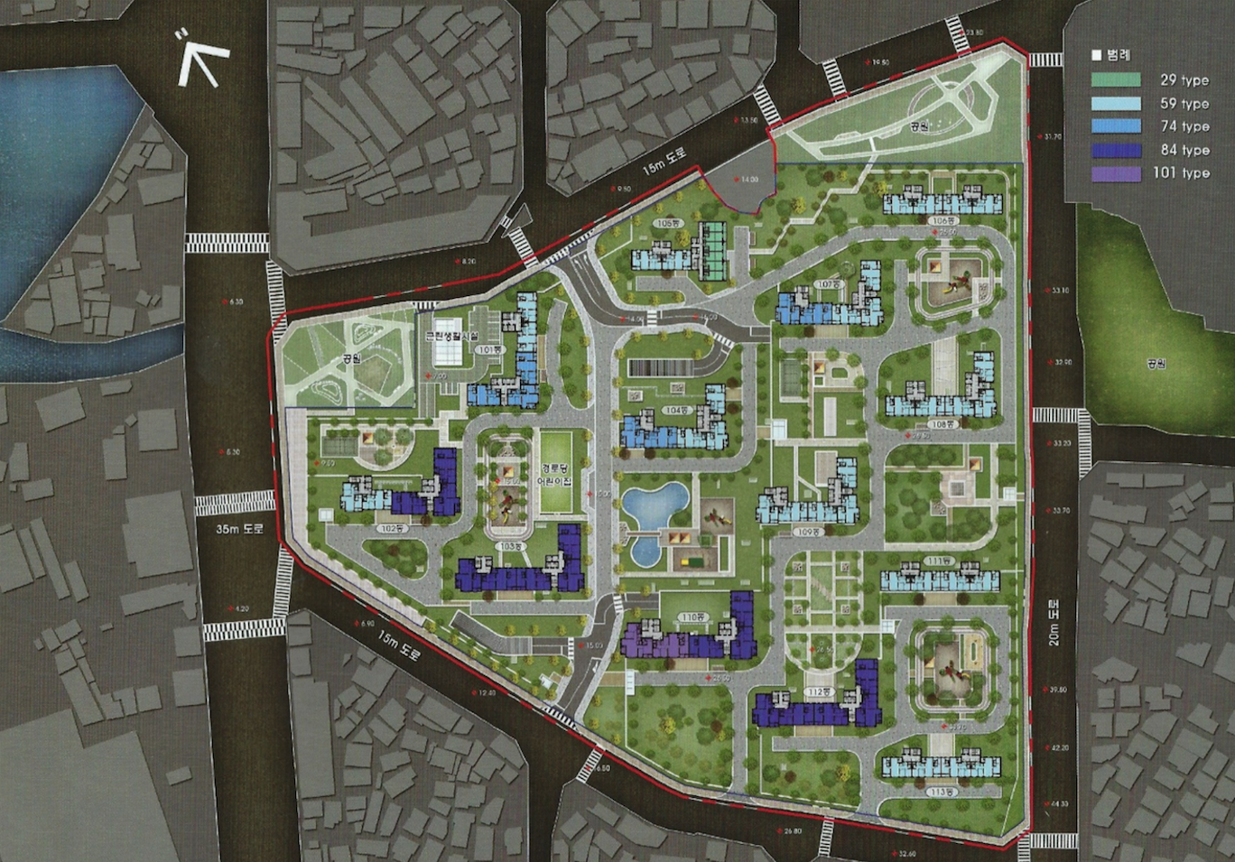 총 1777세대의 대단지로 대체적으로 아래 평지에 위치하고 대로변이 가까워 접근성이 좋으며
