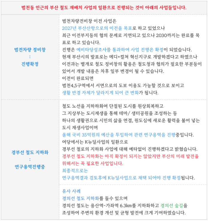향후 경부선철로 지하화와 범천 차량정비창이 이전하게 되면 접근성 및 생활 환경이 크게 개선될 것으로 예상되는 재개발 예정지 구역으로