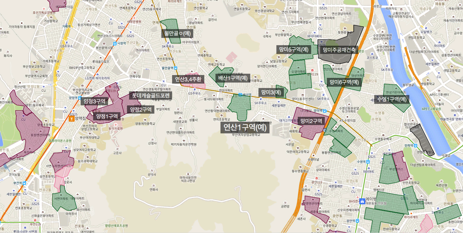 양정1구역, 양정2구역, 연산롯대케슬골드포레, 연산드샵, 힐스테이트 연산, 망미2구역등으로