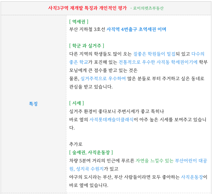 - 역세권 + 학군 + 실거주 + 시세좋은 + 인접 숲세권