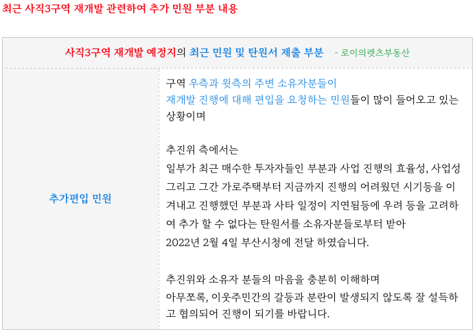 최근에는 구역 인근 지역 소유자분들의 편입 민원들이 많이 들어와