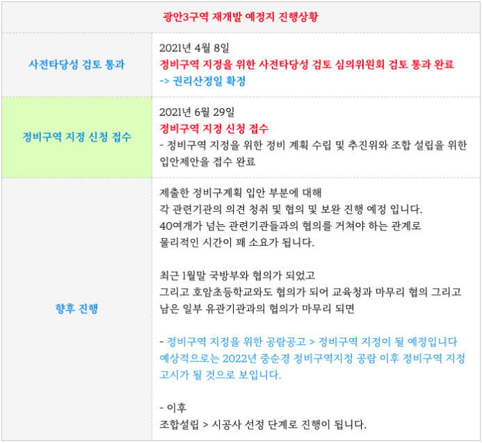 광안3구역 재개발 예정지의 현재까지의 진행상황등을 간략히 정리하였습니다.