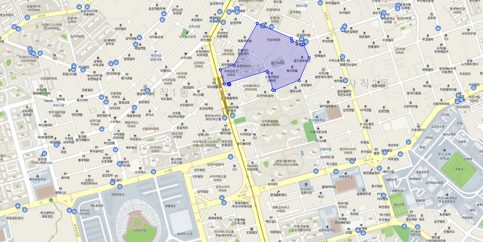 부산 지하철 3호선 사직역 4번출구에 접해 있어 역세권의 장점과