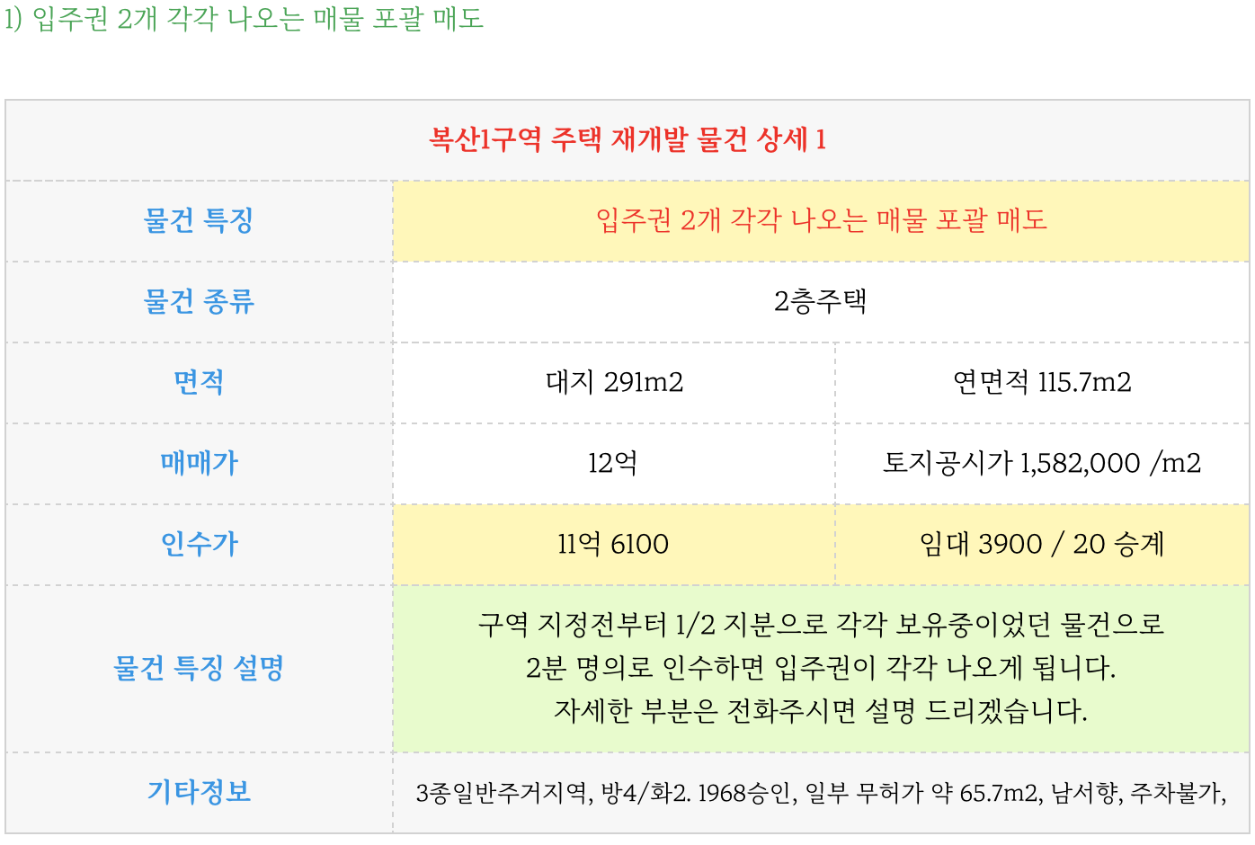복산1구역 재개발 의 인수 가능한 물건을 소개해 드리겠습니다.