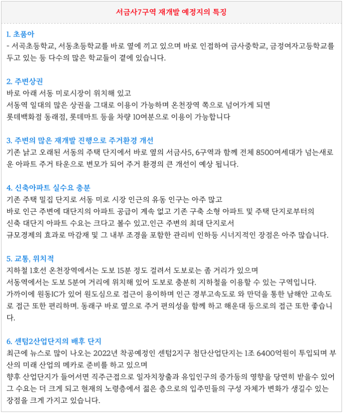 서금사7구역 재개발 예정지의 특징을 간략히 설명 드리겠습니다.