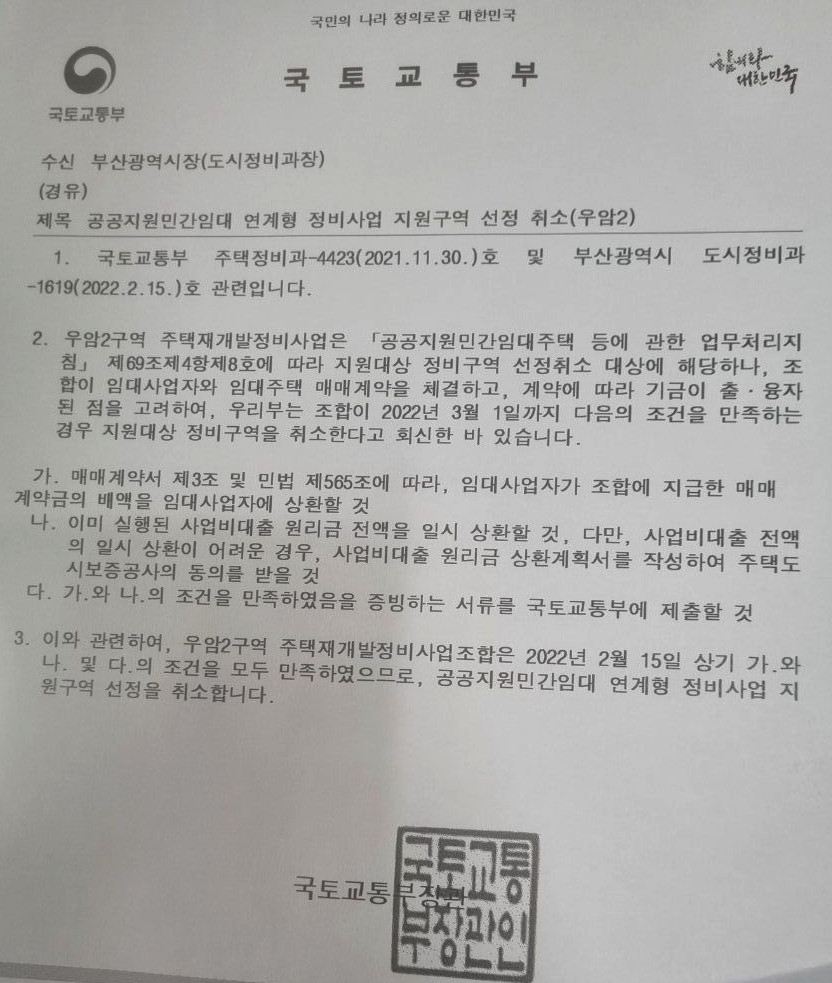우암2구역 재개발의 뉴스테이 지정 취소 통지 되었습니다.