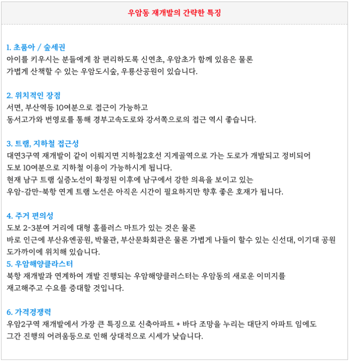 실제 우암동은 서면, 부산역으로 10분이면 접근이 가능한 위치적 장점을 가지고 있습니다.
