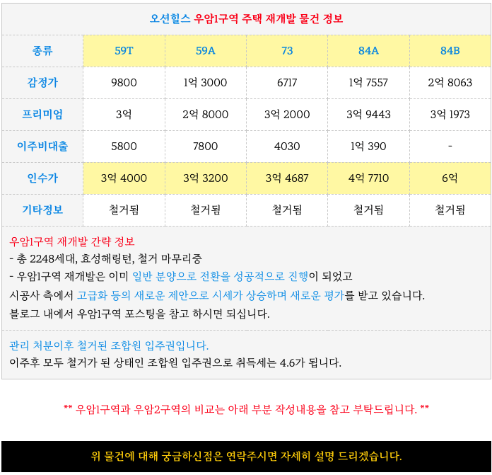 우암1구역 재개발과 우암2구역 재개발의 간략 비교 부분입니다.