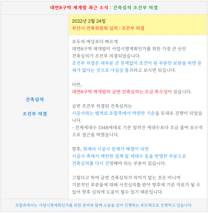- 최근소식은 건축심의에 조건부 의결이 되었습니다.