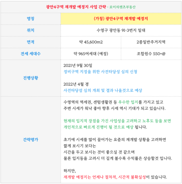 "(가칭) 광안4구역 재개발 예정지 : 시세 최저 물건 " + 4월 사타심사 예상