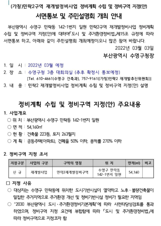 " 민락2구역 재개발(예) : 3월공람공고 소식 " + 시세최저 부속토지 매물