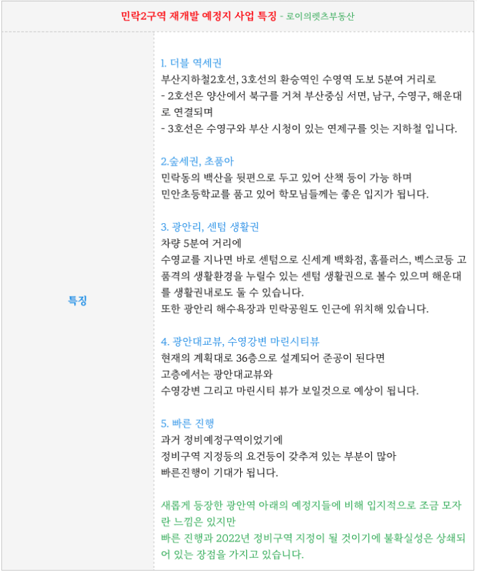 민락2구역 재개발 예정지의 특징을 정리하였습니다.