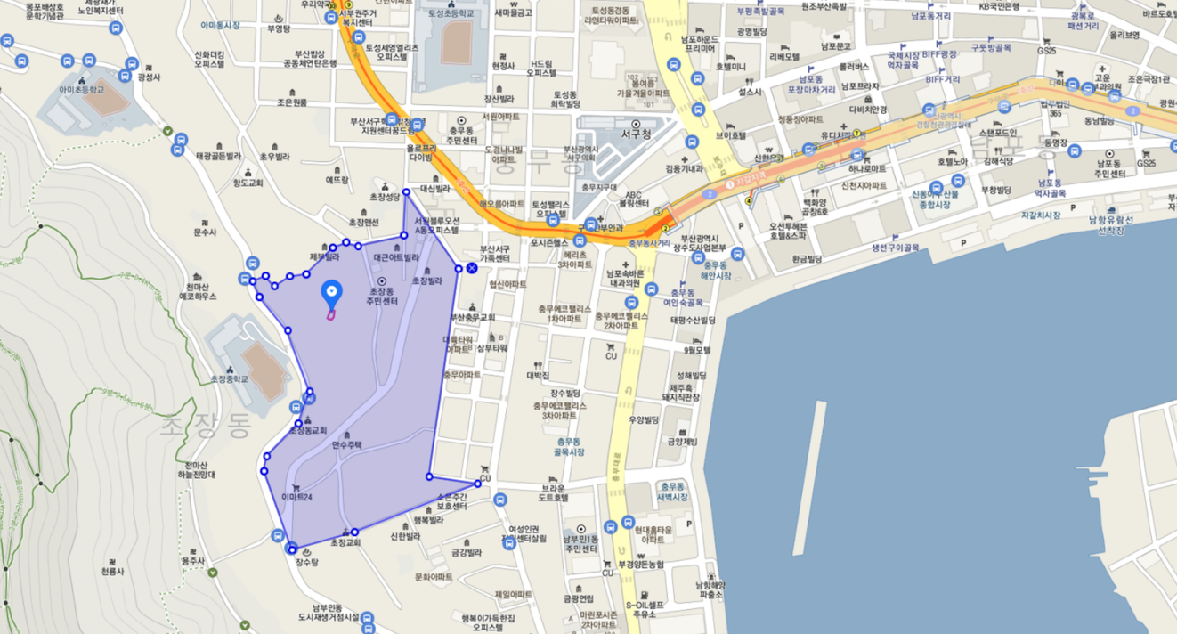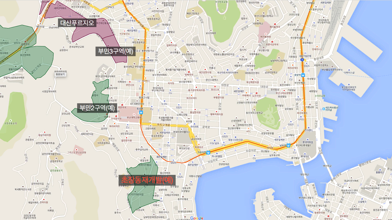 그 아래로 부민3구역, 부민2구역이 있고 그 아래 초장동 재개발이 위치해 있어