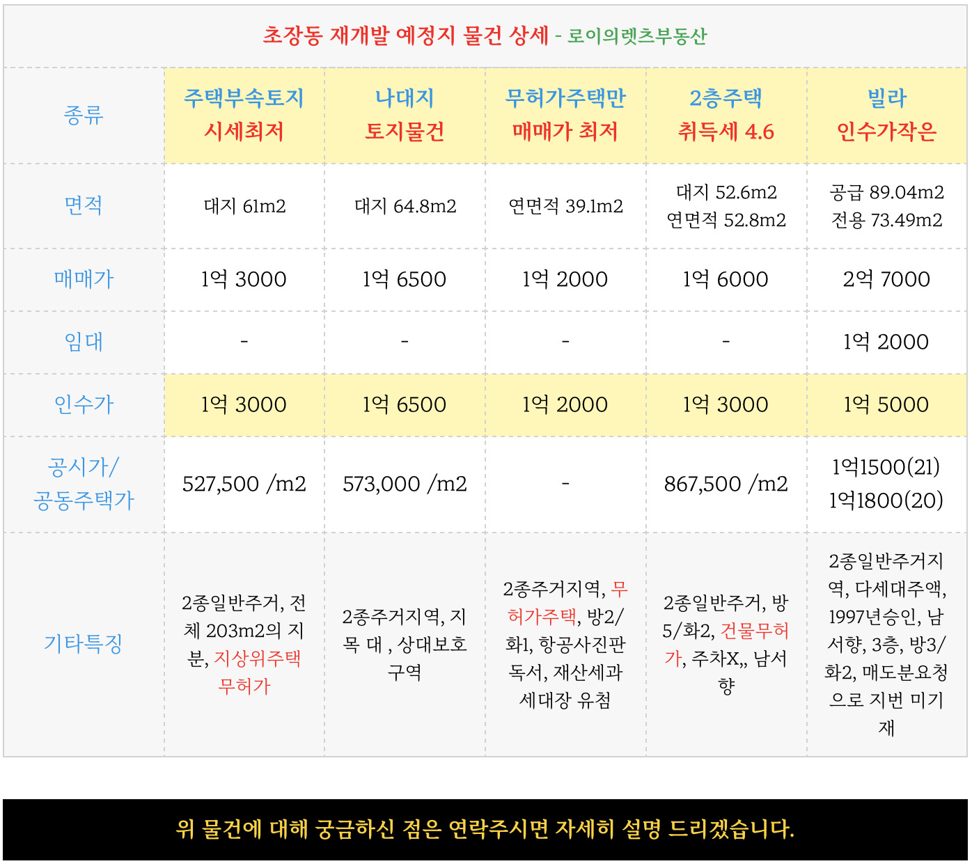 초장동 재개발 예정지 의 물건을 먼저 업데이트하여 드리겠습니다.