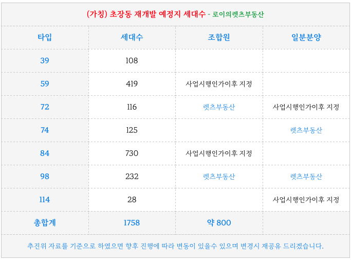 초장동 재개발 예정지의 추진위의 추정 예정 세대수 입니다.