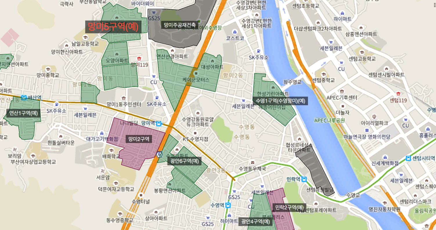 망미주공(연산5재건축)이 재건축 진행중이며 그 아래로는 수영강변 재개발 예정지 가 있으며