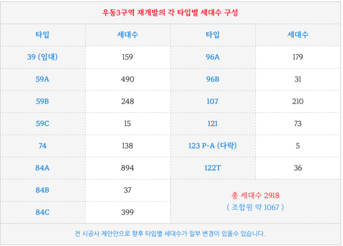 해운대 우동3구역 재개발의 타입별 세대수 입니다.
