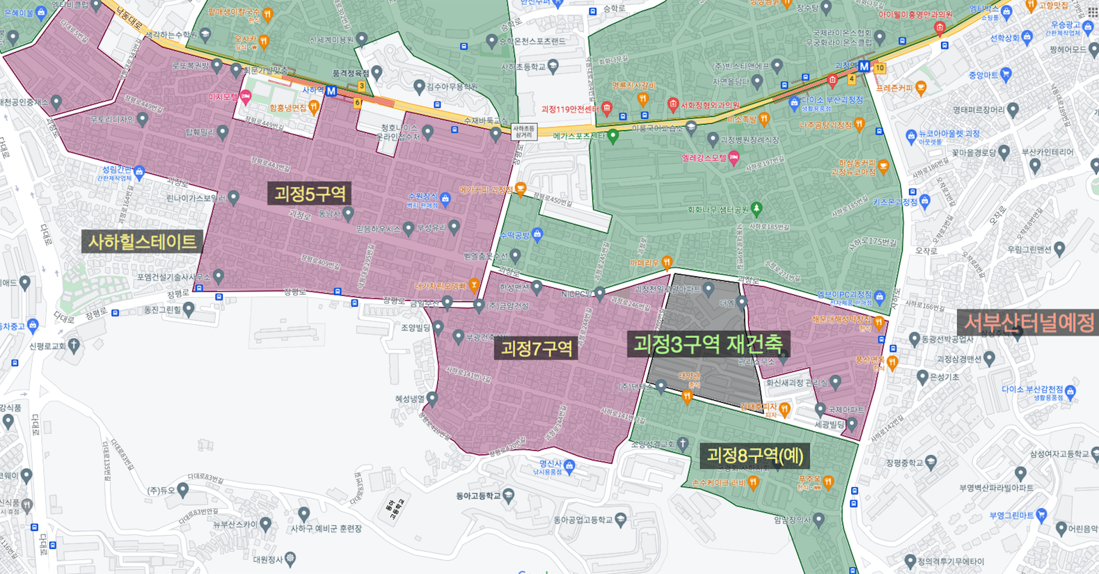 괴정역 왼쪽 하단에 위치한 협진태양과 천일로얄아파트등을 포함하여