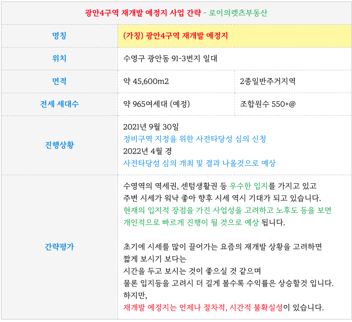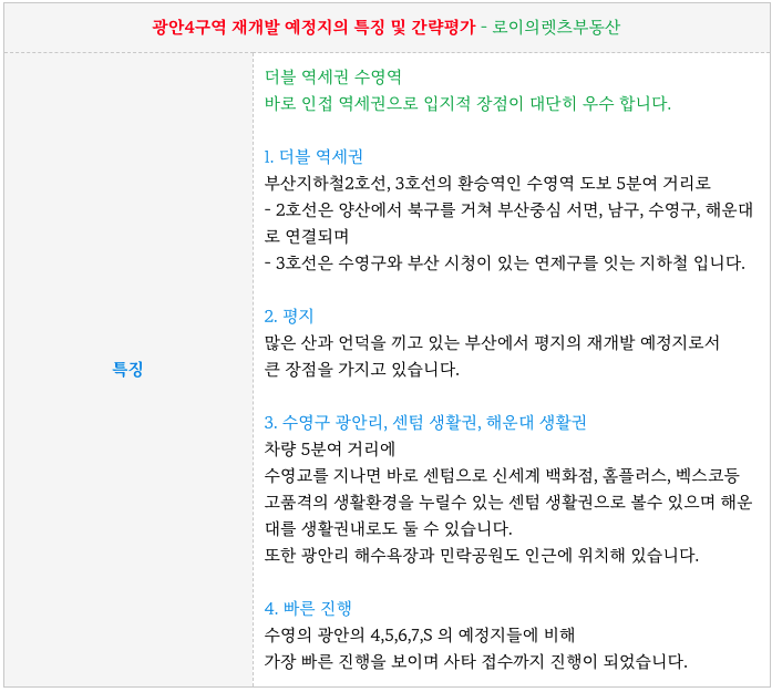광안4구역 재개발 예정지의 특징을 다시 한번 정리 하였습니다.