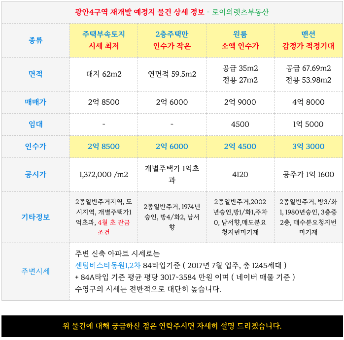 (가칭) 광안4구역 재개발 예정지 시세 최저 물건 부터 소개해 드리겠습니다.