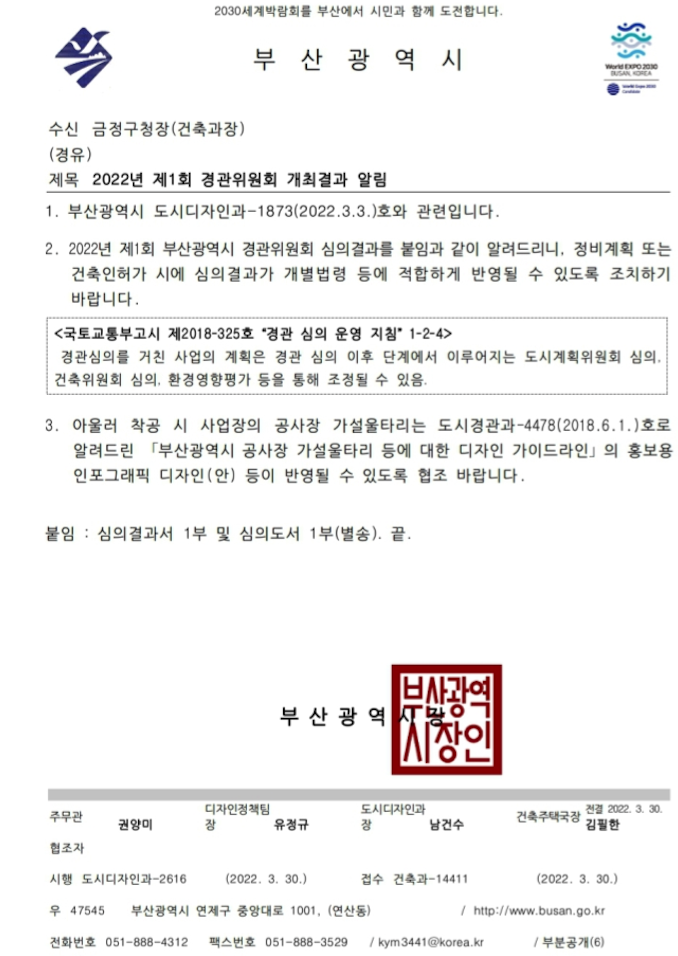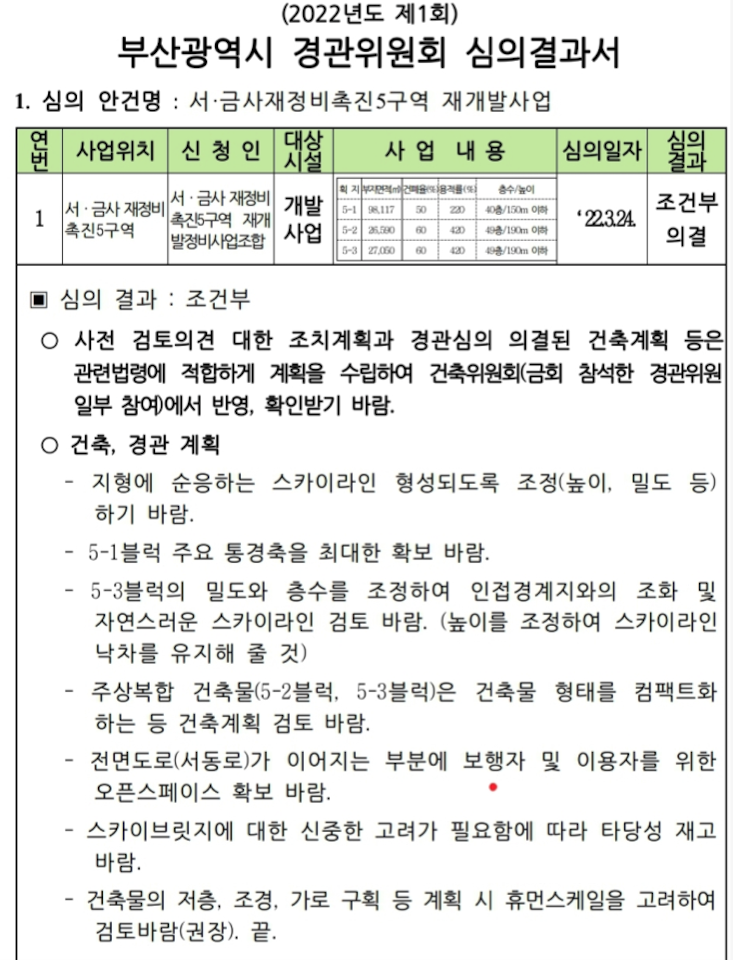 - 사업시행계획인가를 첫 단계인 경관심의가 조건부 의결로 통과 됨에 따라