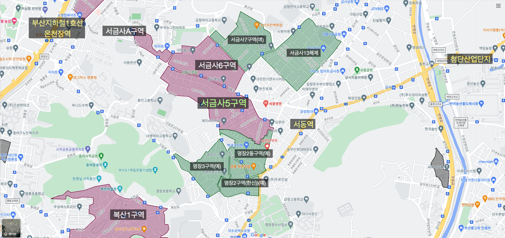 - 서금사5구역과 바로 맞붙어 있으나 조합 내부적으로 조금 마찰이 있어 진행이 조금 지연되고 있어