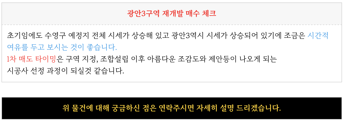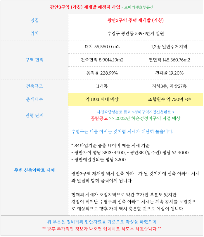 광안3구역 (가칭) 재개발 예정지 에 대해 궁금하신점은 연락주시면 자세히 설명드리겠습니다.