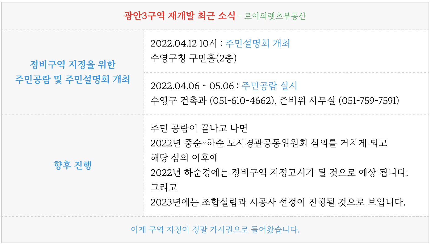 " 광안3구역 재개발 : 구역지정 공람 및 주민설명회 " + 신축원룸 등 매물 소개