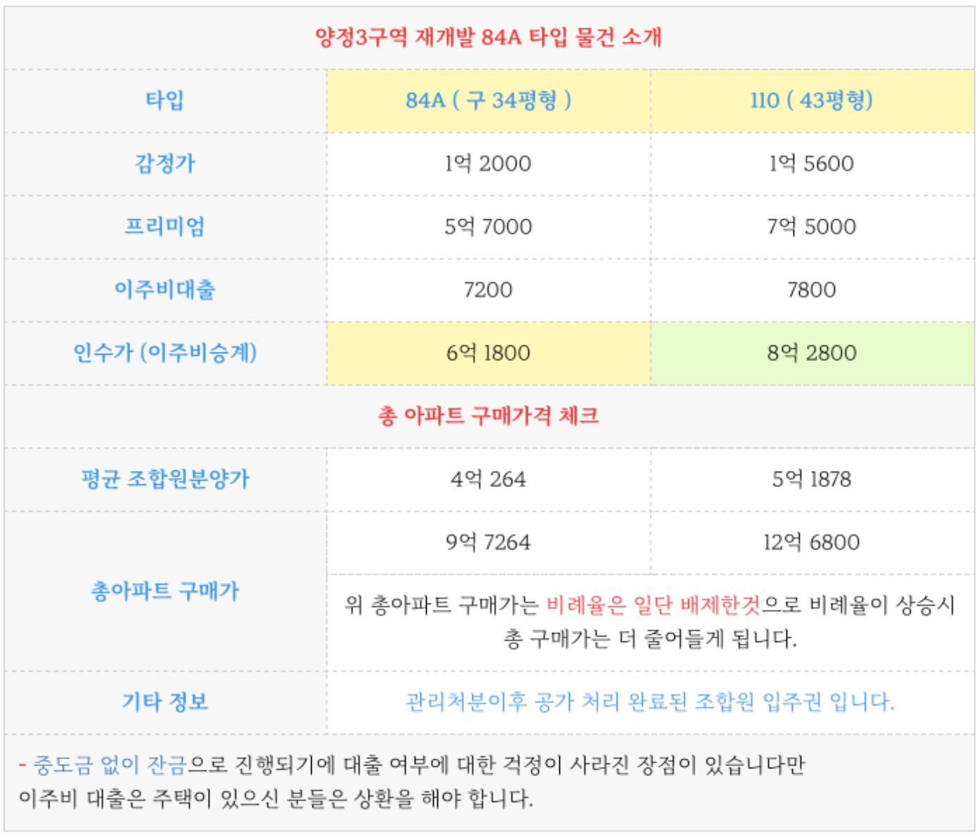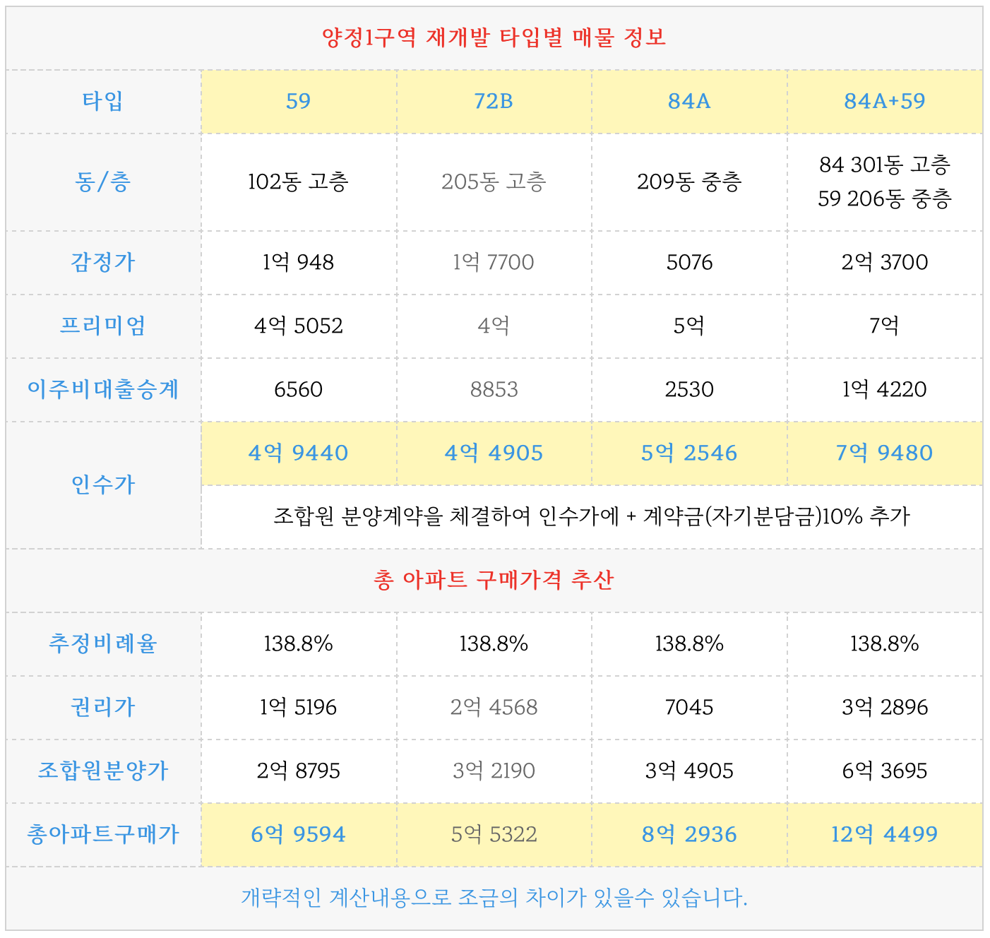 양정1구역 재개발 조합원 입주권 물건 타입별로 업데이트하여 소개해 드리겠습니다.