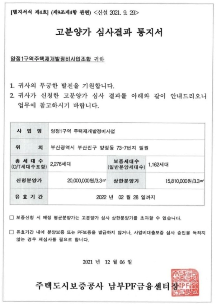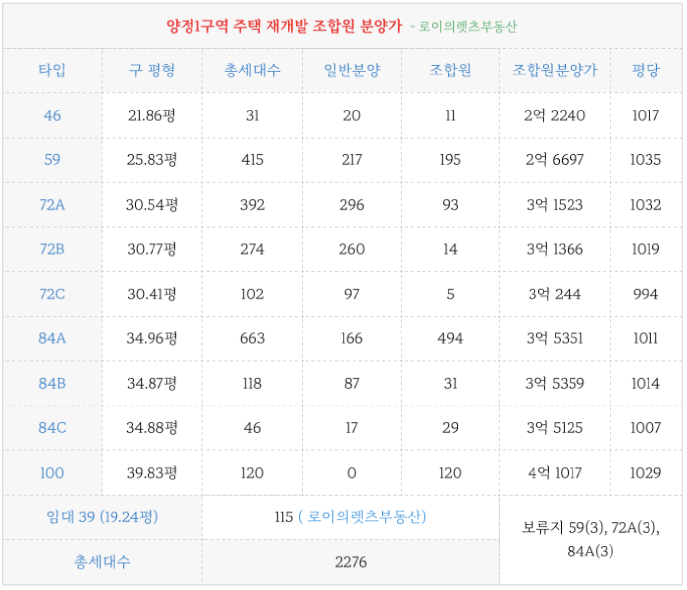 양정1구역 재개발 타입별 세대수 및 평균 조합원 분양가는