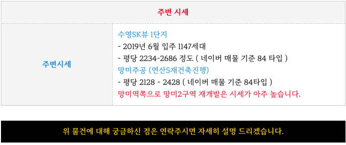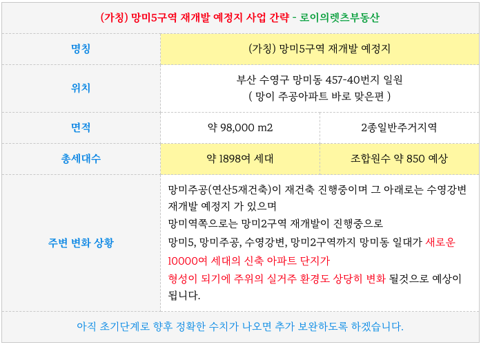 (가칭) 망미5구역 재개발 예정지 에 대해 궁금하신 점은 연락주시면 자세히 설명 드리도록 하겠습니다.