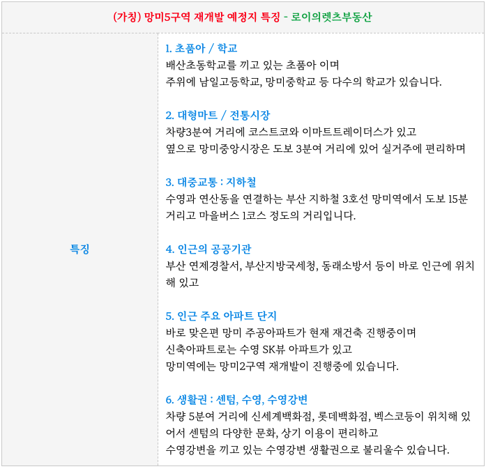 수영구 망미5구역 재개발 예정지 구역 특징을 간략히 정리 드립니다.