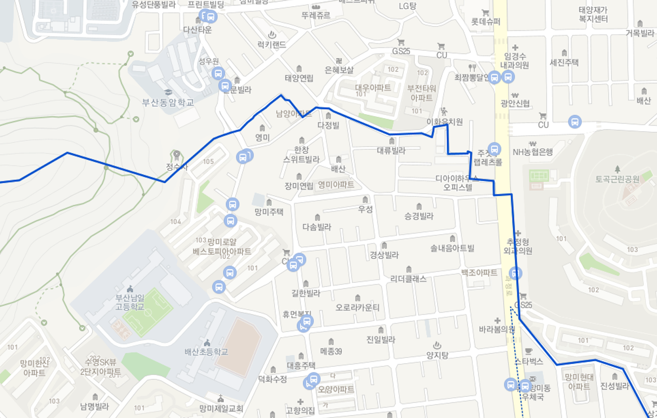 지하철은 망미역에서는 마을버스 1코스 정도로 도보 15분여가 소요되는 위치에 있습니다.