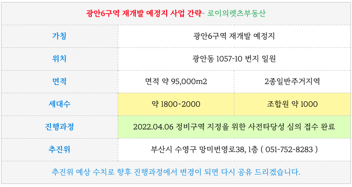 광안6구역 재개발 예정지 물건 정보를 소개하여 드립니다.