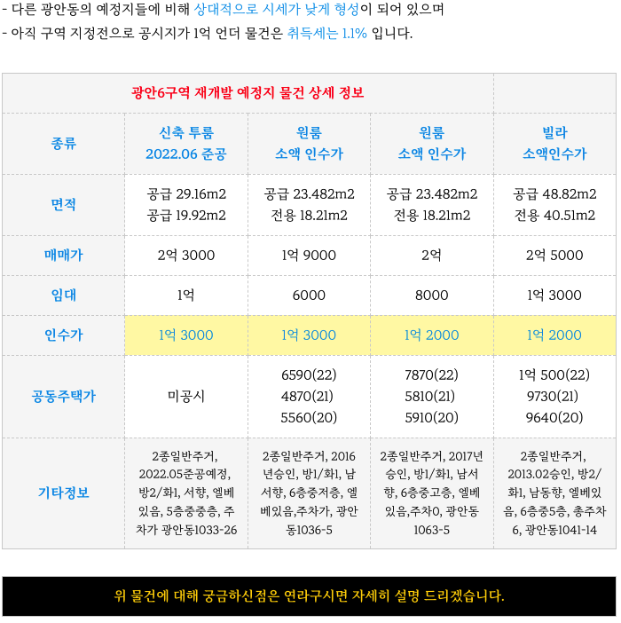 수영구 광안6구역 재개발 예정지 물건 정보를 업데이트 하여 소개해 드리겠습니다.