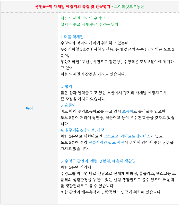 광안6구역 재개발 예정지의 특징을 간략히 정리해 드리겠습니다.